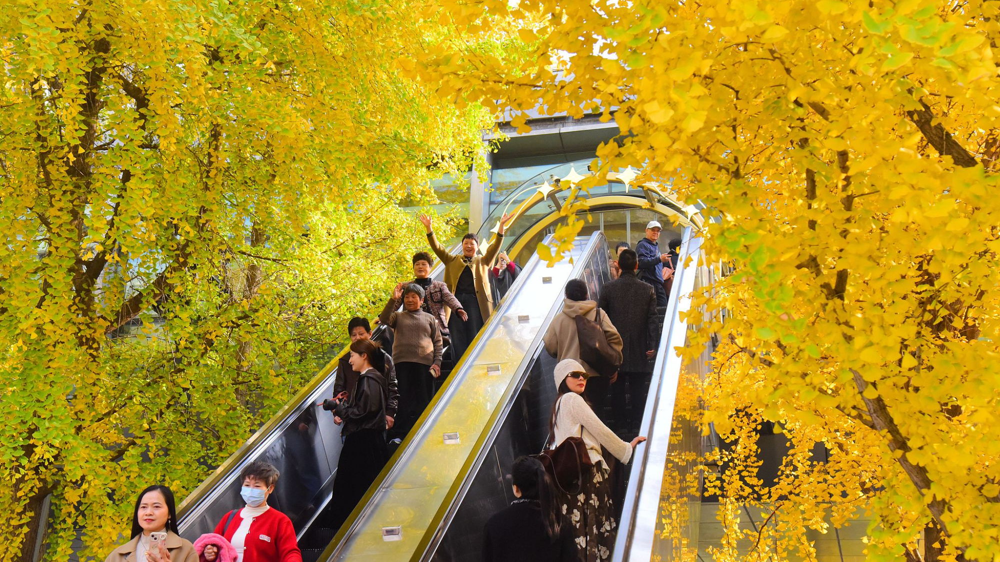 Im Frühwinter erstrahlt die ostchinesische Stadt Hangzhou in einem sanften goldenen Schimmer. Im Stadtzentrum ist eine Rolltreppe von zwei riesigen Ginkgo-Bäumen mit goldgelben Blättern eingerahmt. Der atemberaubende „goldene Tunnel“ ist ein sehr beliebtes Fotomotiv, da man beim Hinauffahren direkt durch das prachtvolle Blätterdach gleitet. (Foto / VCG)